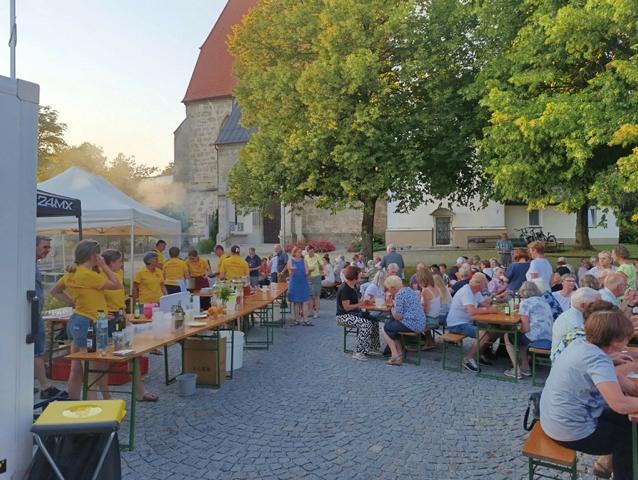Erstmals fand die anschließende Bewirtung am neu gestalteten Dorfplatz zwischen Kirche und Gemeindezentrum statt. Die laue Sommernacht, das stimmungsvolle Ambiente und die schöne Gemeinschaft luden zum Verweilen ein - viele blieben bis in die späten Abendstunden sitzen.
